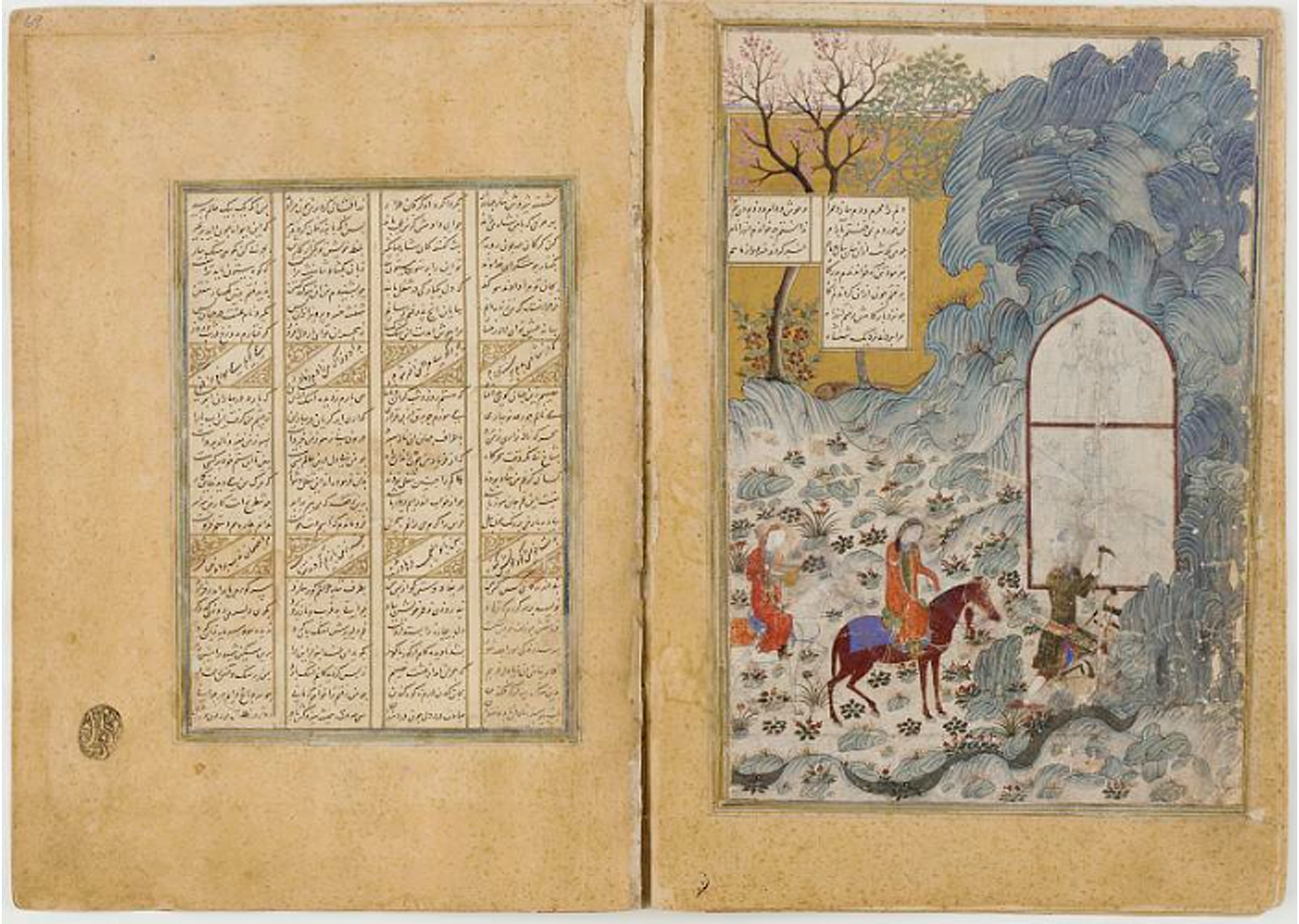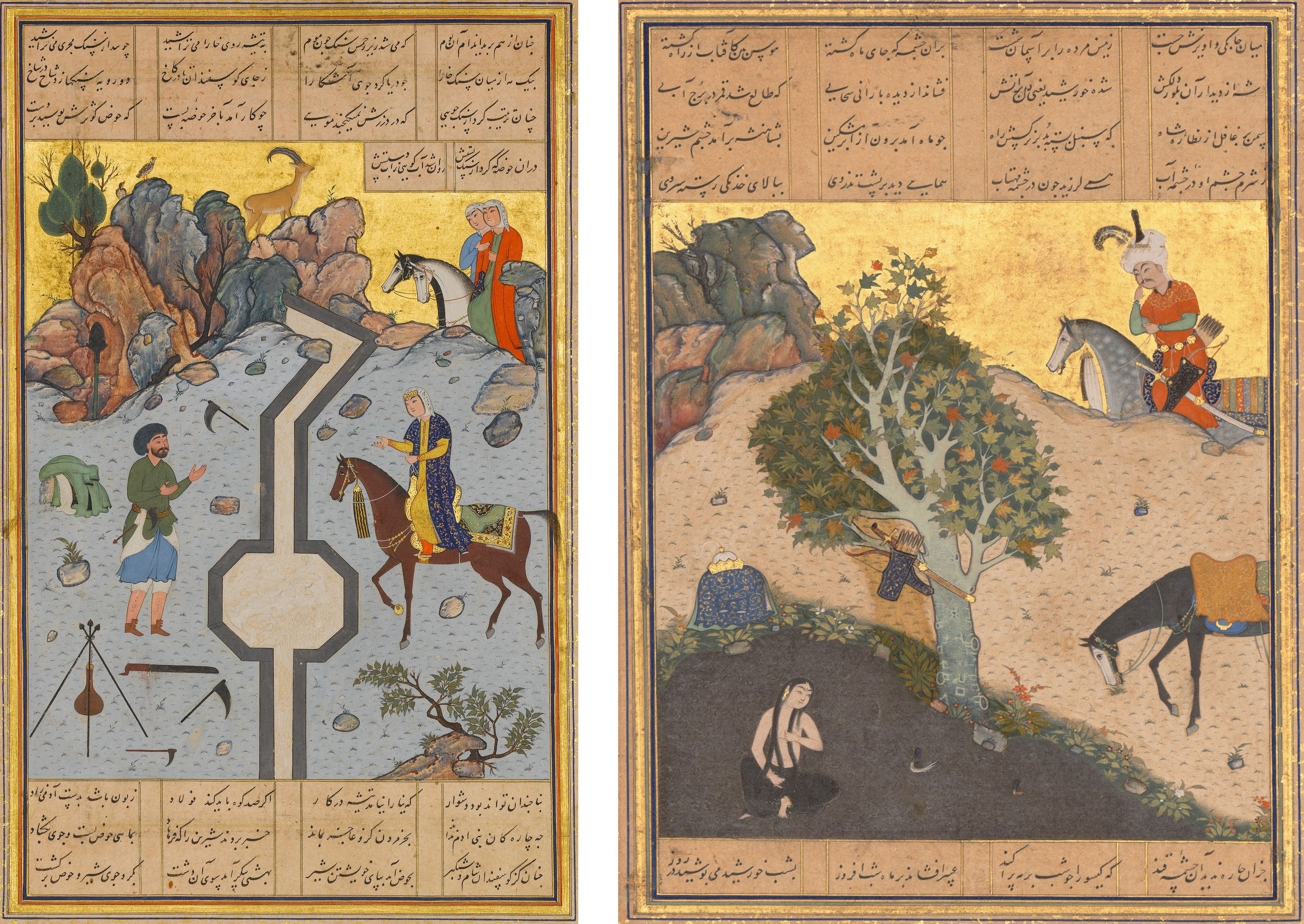 Слева: «Фархад прорубает молочный канал для Ширин». Справа: «Хосров видит купающуюся Ширин», лист из «Хамсы» (квинтета) Низами. Каллиграф: Султан Мухаммад Нур (ок. 1472–ок. 1536). Художник: Шейх Зада. Современный Афганистан, Герат. – Музей Метрополитен.